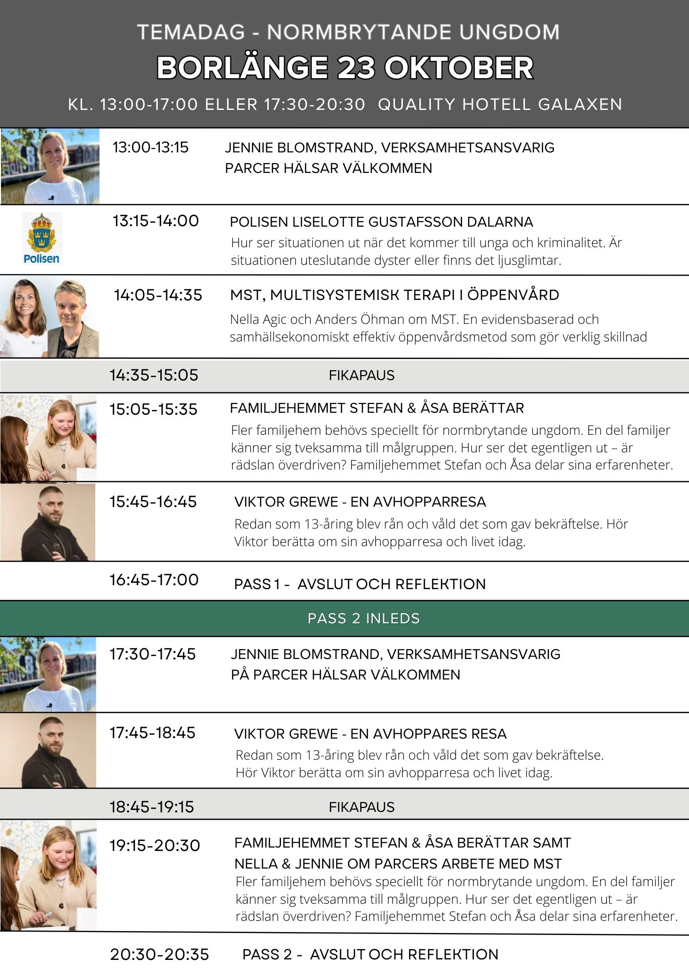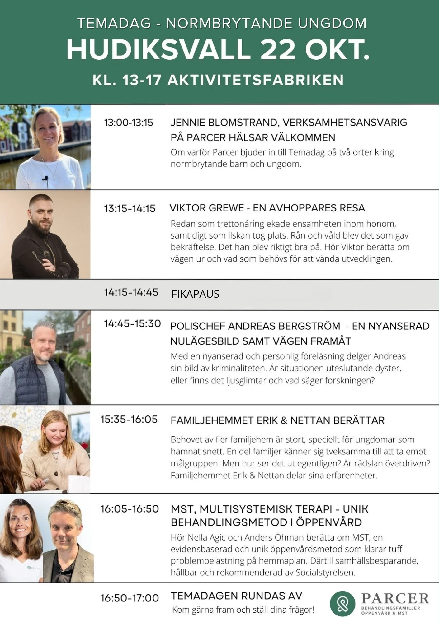 Den 22 oktober bjuder Parcer in till en inspirerande eftermiddag på Aktivitetsfabriken i Hudiksvall och den 23 oktober i Borlänge. Fokus barn och ungdomar som utmanar normer. Under respektive dag får du ta del av starka berättelser, nya perspektiv och konkreta vägar framåt – från en avhoppares resa till polisens nulägesbild och familjehemmets viktiga roll.